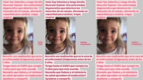 La cuenta @todosporemmita, realizará un vivo éste jueves vía Instagram para viralizar el caso de Valentina, la rosarina que sufre Atrofia Muscular Espinal y está a la espera de los resultados médicos para recibir su medicamento. La pequeña de dos años tiene que administrar su dosis antes de cumplir los dos años, lo cual la fecha límite es el 24 de abril.