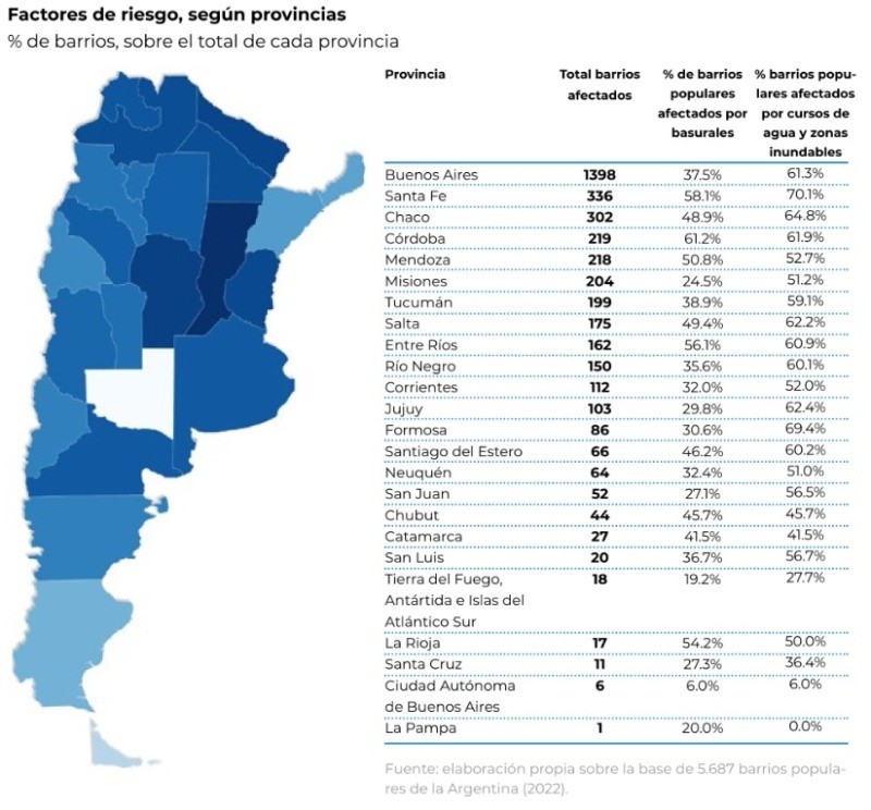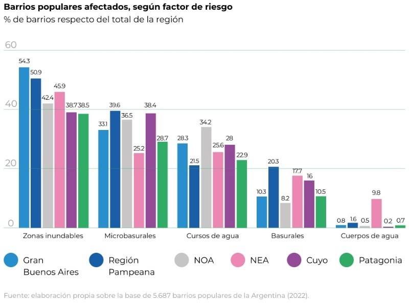 El 40% de los barrios populares de Argentina se encuentran expuestos a por lo menos un factor de riesgo ambiental, como inundaciones o contaminación por presencia de residuos y cercanía con cursos y cuerpos de agua en mal estado. Además, la falta de recursos e infraestructura agrava este panorama.