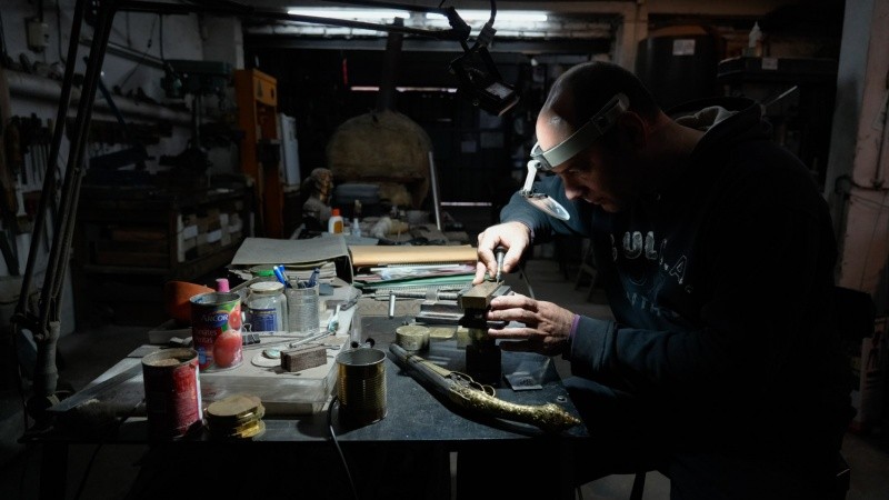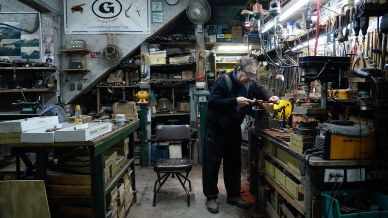 Una lata de tomates perita vacía descansa sobre una mesa de trabajo amplia y de madera. Al lado, una pistola balcánica del año 1720 ostenta su repujado en bronce, con figuras en rombo que se anudan en una guarda y se estiran como pétalos. Martín Gatto, que con su padre Osvaldo le dan vida a este taller único de restauración y réplicas de fábricas de armas antiguas en Rosario, trabaja en esa pieza.