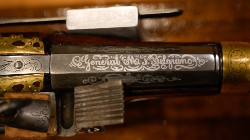 “¿Le regalan un arma española al tipo que tiene que pelear con los españoles y viene de las victorias en Tucumán y Salta? Se me ocurrió que él, como todo prócer, personaje que debía cuidar su vida, tenía que tener una. Entonces, fue, la compró y después la hizo grabar”, dice y consta en el libro que el nombre relleno en plata “General M. J. Belgrano” es posterior a la fabricación.