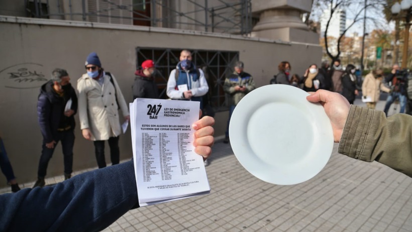 Los propietarios de bares y restaurantes rosarinos que organizaron y participaron de esta protesta también reclaman una "ley de emergencia gastronómica provincial", en el contexto de las restricciones que impuso para el sector la pandemia de coronavirus.