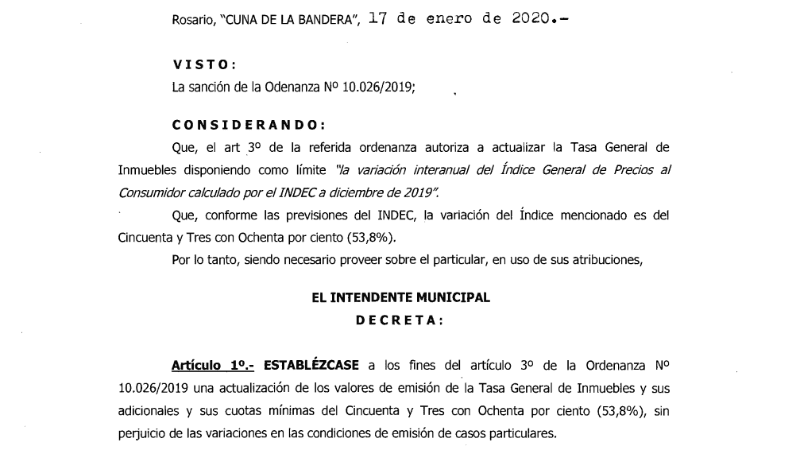 El decreto 092 del 17 de enero de 2020 establece un aumento del 53,8 por ciento de la Tasa General de Inmuebles (TGI) y lo justifica en el artículo 3 de la ordenanza 10.026/2019.