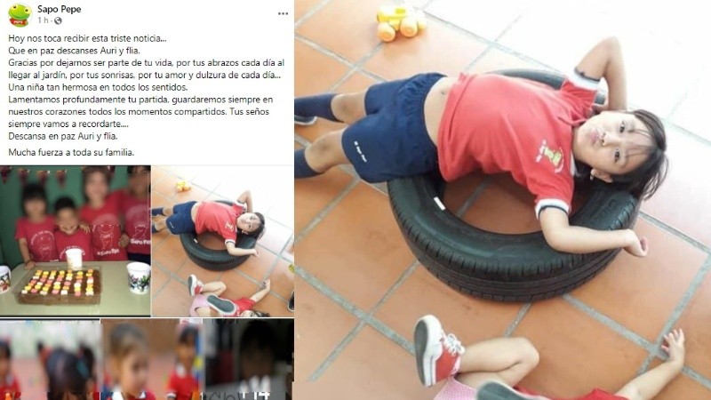 "Hoy nos toca recibir esta triste noticia. Que en paz descanses Auri y familia", escribieron las autoridades del "El Sapo Pepe", el nombre del lugar a donde iba la nena de 6 años acribillada junto a sus padres el viernes a la noche en la zona sur.