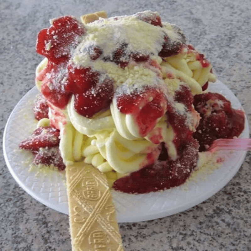La receta es la misma que la que, en estas latitudes, popularizó Polito: helado de vainilla pasado por el prensapapas, puré de frutillas a modo de salsa de tomate y el chocolate blanco pisado como si fuera queso rallado.