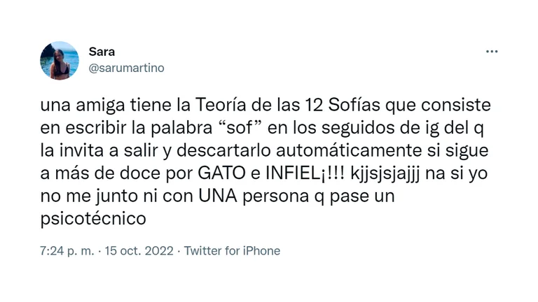 El tuit dice así: “Una amiga tiene la teoría de las doce Sofías que consiste en escribir la palabra «Sof» en los seguidos de Instagram del que la invita a salir y descartarlo automáticamente si sigue a más de doce por gato e infiel jaajajajaja!! Nah, si yo no me junto ni con una persona que pase un psicotécnico”.