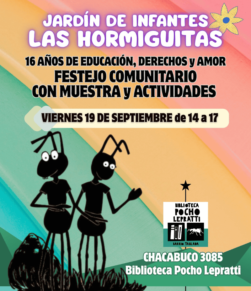 El jardín de infantes “Las Hormiguitas”, de la Biblioteca Popular Pocho Lepratti, festeja este viernes sus 16 años de vida con un encuentro que tendrá música, animación, lecturas y radio abierta.