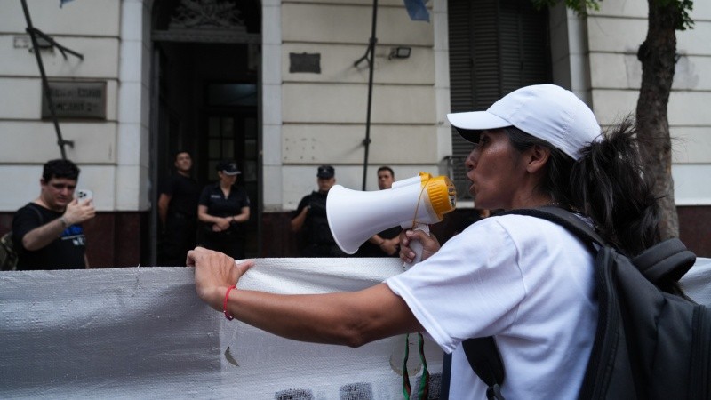 Vanesa y Desire, al frente de la columna de unas cien personas, doblan en calle Paraguay y frenan en la puerta de la comisaría segunda. Hay tres agentes parados en la puerta.