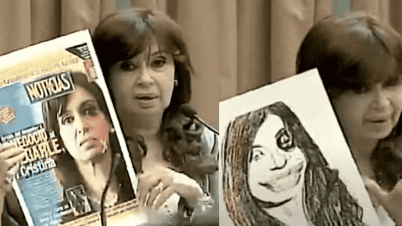 Durante su declaración ante Tribunal Oral Federal Número 6, Cristina respondió sobre si sentía que había sufrido violencia durante sus dos mandatos como presidenta. Analizó una portada de la Revista Noticias de ella con el ojo negro y una caricatura del dibujante Hermenegildo Sábat publicada en Clarín que la llevaron a mencionar la denuncia por violencia de género contra Alberto Fernández de la ex primera dama Fabiola Yánez.