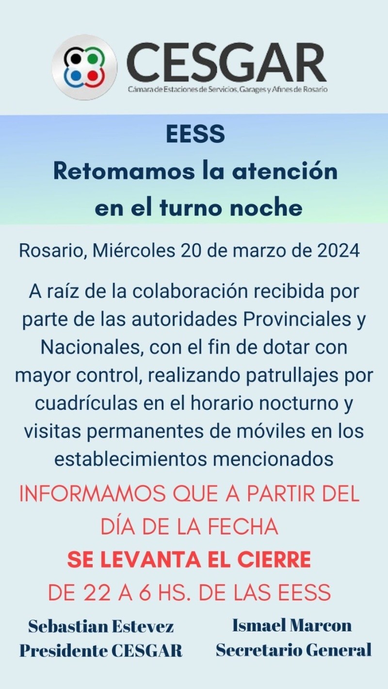 “A raíz de la colaboración recibida por parte de las autoridades provinciales y nacionales, con el fin de dotar con mayor control, realizando patrullajes por cuadrícula en el horario nocturno y visitas permanentes de móviles en los establecimientos mencionados, informamos que a partir del día de la fecha se levanta el cierre de 22 a 6 en las estaciones de servicio”, dice el texto firmado por ambas organizaciones que difundieron este miércoles.