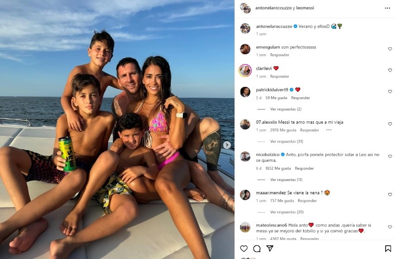 "Verano y ellos", fue el breve comentario que hicieron Anto y Lionel en el posteo conjunto con el que dieron a conocer un carrousel de fotos en el que se los pudo ver muy divertidos en un paseo familiar a bordo de un yate.