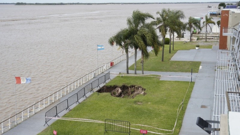 Las fuertes lluvias del fin de semana provocaron un socavón en el muelle de la Estación Fluvial, que fue vallado mientras se preparan las refacciones.