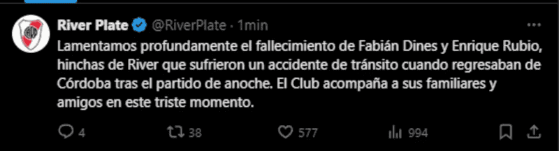 "Lamentamos profundamente el fallecimiento de Fabián Dines y Enrique Rubio, hinchas de River que sufrieron un accidente de tránsito cuando regresaban de Córdoba tras el partido de anoche. El club acompaña a sus familiares y amigos en este triste momento", escribieron.