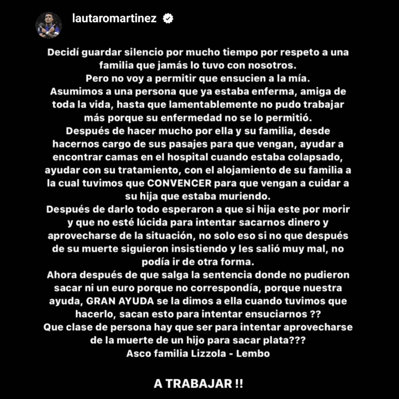 Y finaliza: "Qué clase de persona hay que ser para intentar aprovecharse de la muerte de un hijo para sacar plata. Asco familia Lizzola-Lembo. A trabajar".
