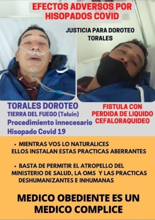 Mientras continúa internado en observación, Torales confirmó que denunció penalmente a la médica Andrea Carreño, de 50 años y 24 de ejercicio de la profesión, que lo atendió en Tolhuin y optó por no dar explicaciones públicas hasta el momento. La denuncia, tramitada en primera instancia ante la comisaría de la localidad fueguina, ingresó al Juzgado de Instrucción 1 de Río Grande el martes tres de mayo, confirmaron fuentes judiciales. El expediente por presunta "mala práxis médica" quedó a cargo del juez Daniel Cesari Hernández con intervención del fiscal Ariel Pinno, completaron los voceros. "No quiero perder mi trabajo, soy pobre. Hago changas. Si pierdo el trabajo lo pierdo todo", se lamentó el hombre que está solo en Ushuaia, mientras su esposa permanece en Tolhuin al cuidado de su hijo. Un grupo de sus vecinos de la localidad fueguina iniciaron una colecta para ayudarlo, liderada por el periodista Telmo Benítez, propietario de FM Azul. "Hicimos un llamado a la comunidad para reunir fondos. En pocas horas logramos reunir $34 mil. Doroteo trabaja como albañil y vive de changas, agarra trabajitos en la construcción. Cuando me enteré de lo que le pasó me conmovió mucho su historia", explicó Benítez. Por su parte, la médica de Río Grande Viviana Lens (matrícula provincial 2232) afirmó que el método de hisopado nasal para detectar el coronavirus constituye "una técnica invasiva y con potenciales y severos daños para la salud". "Torales sufrió una fístula de líquido cefalorraquídeo. O sea, una lesión entre las fosas nasales y las meninges que recubren el cerebro. Por eso digo que es una técnica innecesaria que puede producir daño e incluso la muerte", aseguró Lens.
