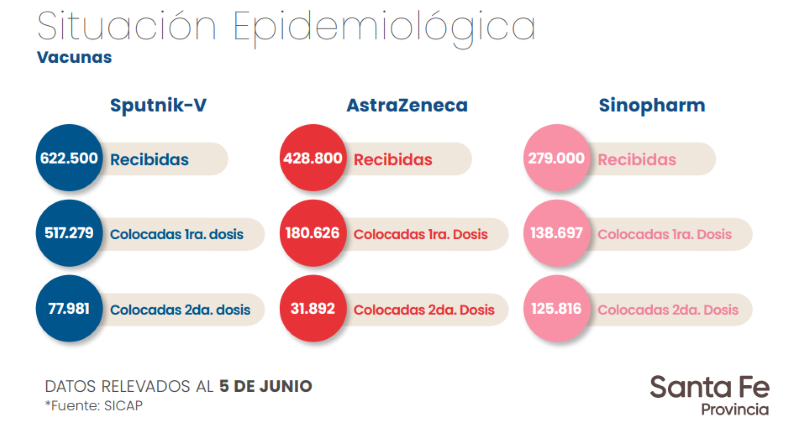 La provincia de Santa Fe aceleró el proceso de vacunación tras la llegada de nuevos lotes de Sputnik y Astrazeneca al país. Nación comenzó a enviar este sábado 371.400 Sputnik V (componente 1) y a este distrito le tocan 30.000. El propio gobernador Omar Perotti anunció 210 mil turnos para la próxima semana y convocó a enfermeros para ampliar la operatoria.