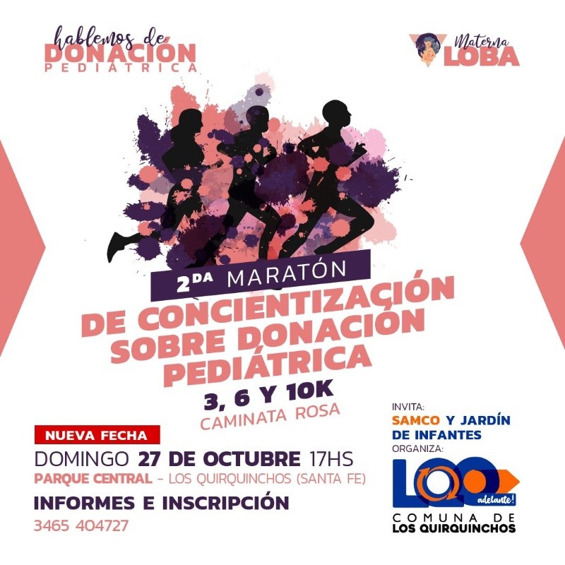 La localidad de Los Quirquinchos tendrá su segunda edición de la Maratón de concientización sobre donación pediátrica, que se realizará el próximo domingo 27 de octubre. Así lo confirmaron desde la organización en las últimas horas.