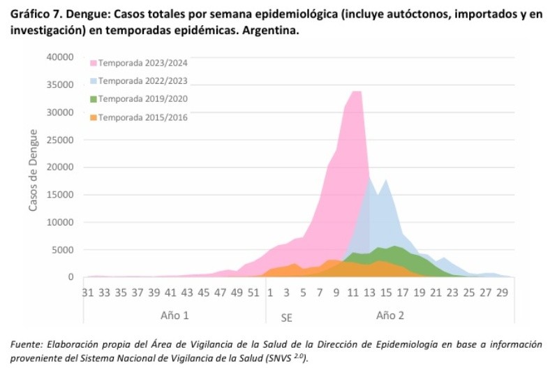 La vigilancia del dengue se realiza de manera estacional, abarcando desde la semana epidemiológica 31 de un año hasta la semana 30 del siguiente, coincidiendo con el pico de actividad del virus, que suele darse durante los meses de verano. Si bien aún restan varias semanas para concluir la medición de este año, ya se superó el umbral de casos récord registrado en la temporada anterior, que era de poco más de 130 mil.