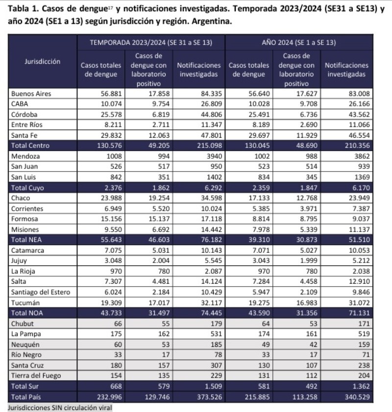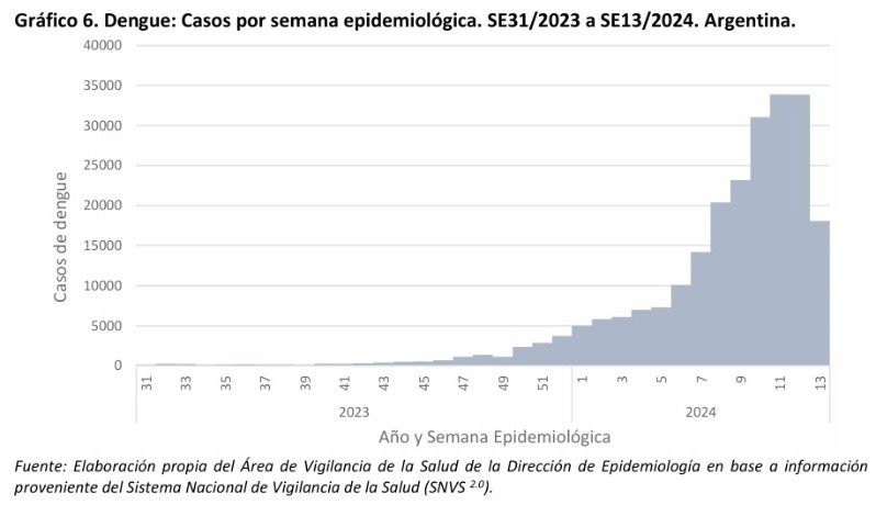 El Ministerio de Salud de la Nación informó que, en lo que va de la temporada 2023/2024 (fines de julio y comienzos de agosto de 2023, hasta fines de marzo de 2024), se registraron en Argentina "232.996 casos de dengue (90% autóctonos, 7% en investigación y 3% importados), de los cuales 215.885 se registraron desde la semana 1 a la semana 13 de 2024".