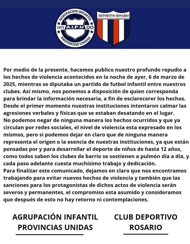 La Agrupación Infantil Provincias Unidas y el club Deportivo Rosario emitieron en conjunto un comunicado en el que "repudia" los hechos de violencia que se registraron en la noche del jueves, protagonizado por padres y madres, mientras se disputaba un partido de fútbol infantil. Hubo reuniones entre los directivos para aplicar sanciones.