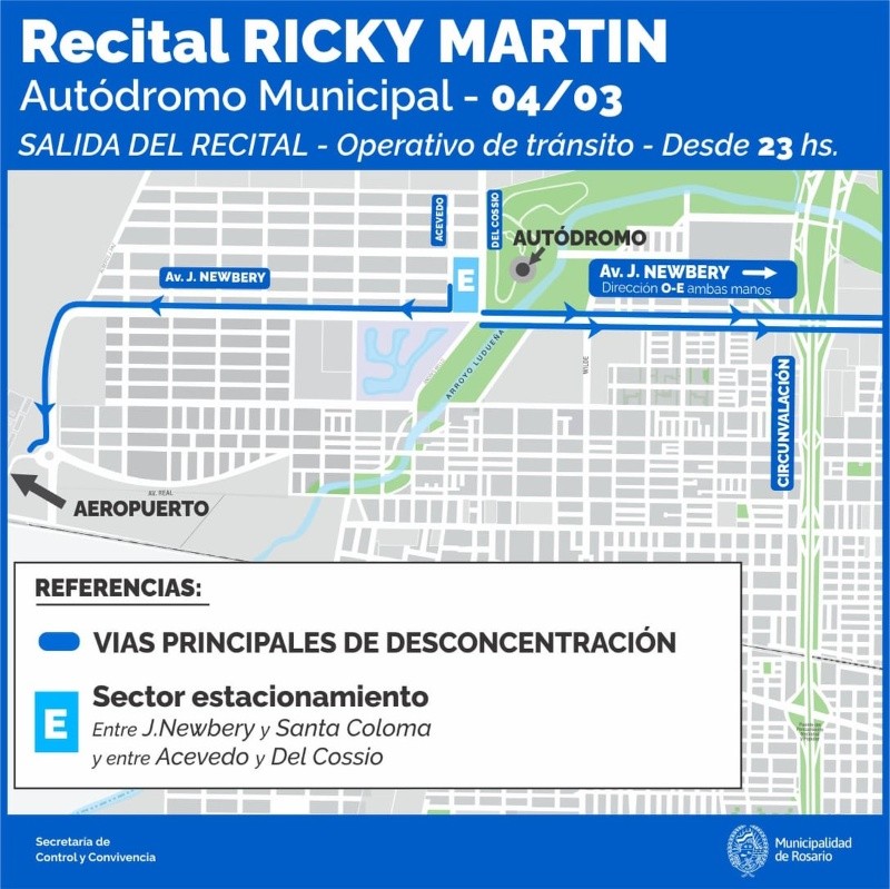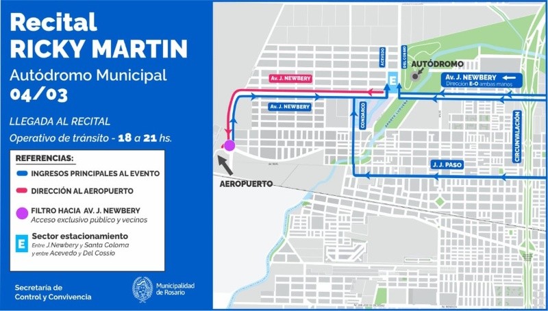 Un operativo de control y ordenamiento del tráfico está previsto para este sábado, en el marco de la presentación del cantante Ricky Martin en el Autódromo de Rosario. Será llevado adelante por personal de la Secretaría de Control.
