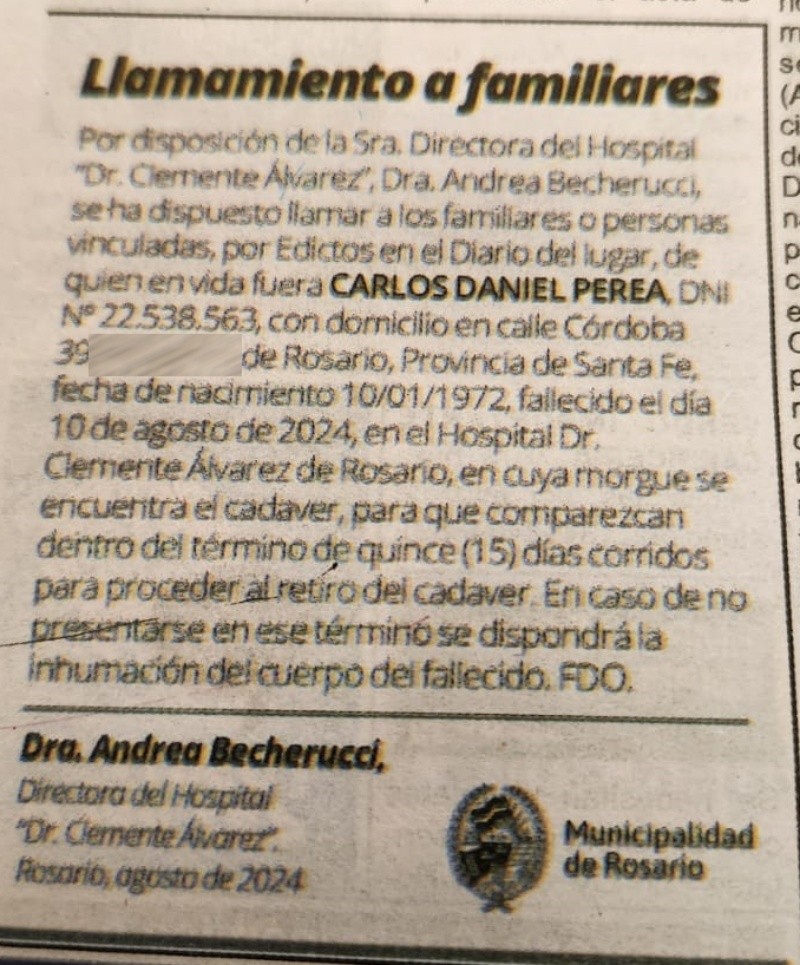 Unos 24 días después de su deceso, todavía nadie se acercó al hospital a reclamar el cuerpo, que permanece en la morgue. Ante esto, la directora del Heca Andrea Becherucci publicó un edicto para dar a conocer la situación e intentar así dar con algún familiar de Perea.