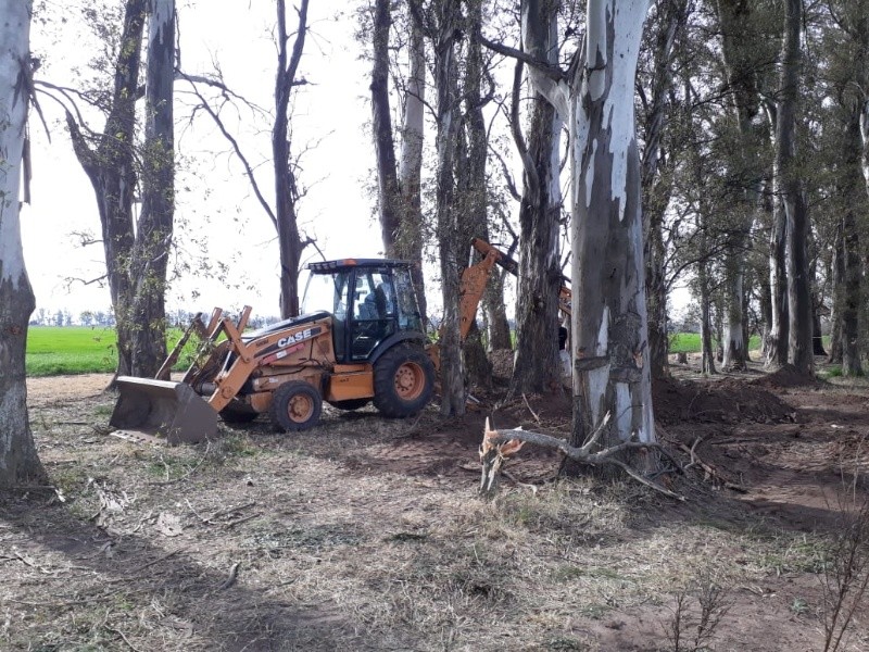 Las máquinas retroexcavadoras trabajan en una superficie aproximada de 50 metros por 20. El sitio puntual está sobre una hilera de frondosos y añejos eucaliptos, muy cerca de un campo sembrado de trigo.