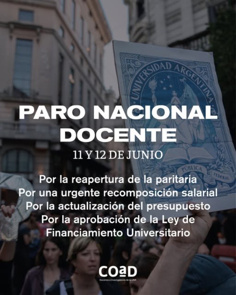Los docentes de la Universidad Nacional de Rosario (UNR) realizarán un nuevo paro de 48 horas el próximo miércoles 11 y jueves 12 de junio. La protesta es en reclamo de la reapertura de la discusión salarial. La medida de fuerza se enmarca en una jornada de lucha nacional.