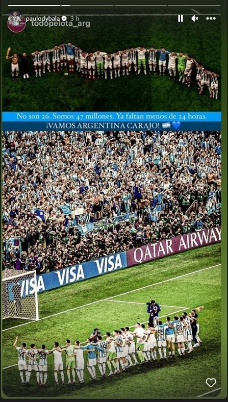Uno de los primeros en comunicar su alegría por el momento que se está viviendo en Qatar fue el volante del grupo, Rodrigo De Paul, quien fiel a su personalidad más sensible y comunicativa con los fans nacionales, escribió una larga carta en su cuenta de Instagram y la adjuntó a la foto donde se los ve a todos los jugadores unidos. Le siguió su compañero Lautaro Martínez, quien aseguró en su posteo virtual que "jugar una final del mundo defendiendo este país adentro de la cancha es el sueño máximo de los 47 millones de argentinos". No faltó tampoco la publicación de una de las estrellas de este equipo y del Mundial: Emiliano "Dibu" Martínez, el guardián del arco argentino que fue decisivo en la serie de penales con los que la albiceleste superó a Países Bajos en los octavos de final. Escueto pero también emotivo, Leandro Paredes se sumó a la serie de posteos de Instagram con el mensaje: "Qué orgullo ser parte de esta selección, un pasito más, vamos Argentina". A pesar de haber tenido poca participación dentro de la cancha en su primera Copa del Mundo, Paulo Dybala no se quiso quedar atrás de los mensajes de dedicatoria a la hinchada argentina. En sus historias de Instagram compartió una imagen publicada por la cuenta "todopelota_ar" donde se ve a los aficionados animando al plantel con una descripción que dice: "No son 26. Somos 47 millones". En tanto, Cristian "Cuti" Romero celebró la buena performance que tuvo el equipo dirigido por Lionel Scaloni en esta edición del torneo de la FIFA y también agradeció a los argentinos de todo el mundo por el aliento. Por su parte, Nicolás Tagliafico escribió: "Último entrenamiento de un viaje maravilloso que recorrimos todos juntos". Y Julián Álvarez, uno de los máximos goleadores de esta Copa del Mundo, realizó un humilde aporte, incomparable con la grandeza que logró junto a la selcción argentina este 2022: "Último pasito, todos juntos".