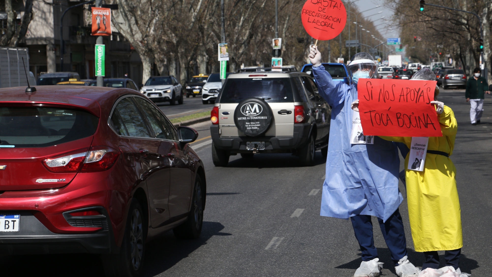 Bajo el lema "se escribe esenciales se pronuncia descartables", personal Covid-19 realizaron una concentración sin cortar la calle pidiendo a los automovilistas que toquen bocina para adherirse al pedido. La explicación que expusieron es que "se desmantelarán los dispositivos que se encargaron de atender a pacientes con síntomas de covid y habrá menos trabajo".