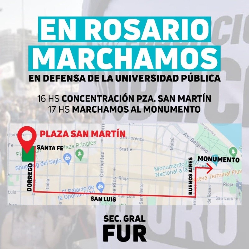 Paralelamente la UTN realizará un abrazo simbólico a la facultad y luego se sumará a la plaza desde donde partirá la marcha organizada por la Federación Universitaria de Rosario (FUR) y los docentes universitarios y que contará con el apoyo de distintas organizaciones sociales y sindicales, entre ellas la CGT y la CTA.