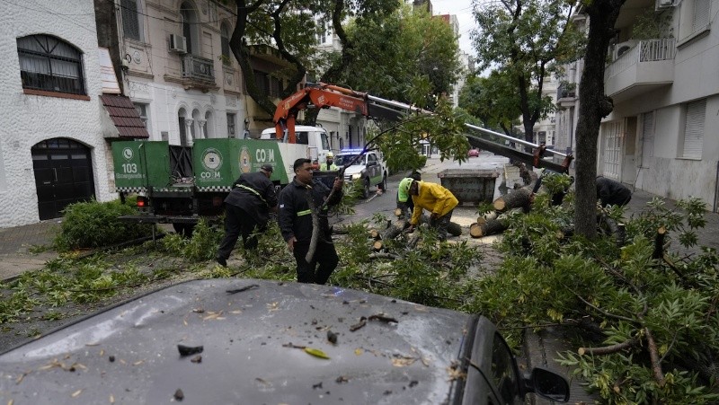 La tormenta, que se desató este domingo a la noche y se extendía este lunes a la mañana, dejó sus huellas en las calles de Rosario. La gran cantidad de agua caída y el viento fuerte tiraron abajo autos y cables, casos que eran atendidos hoy por la Municipalidad de Rosario. El caso de un auto que quedó atrapado debajo de un gran árbol que se desprendió de la vereda.