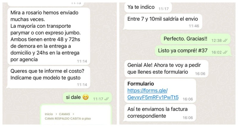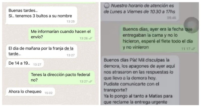 “Cumplido el tiempo pactado de la entrega - 60 días hábiles - le empecé a preguntar por la cama y siempre ponía excusas pero respondía”, señaló a Rosario3 la mujer víctima de la estafa, que además tiene los chats donde la empresa le pasa contacto de un flete que entregaría el producto. Le dieron día y horario de entrega. Pero nunca llegó.