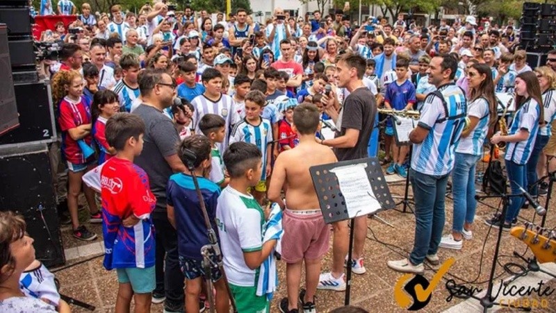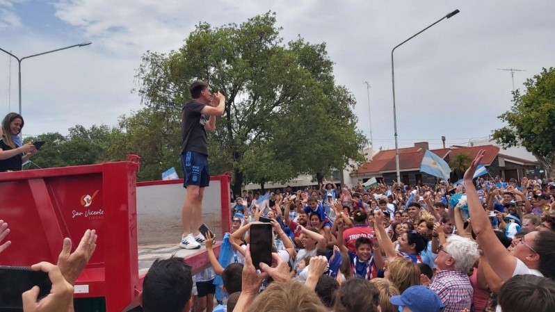 Ni bien pisó tierras sanvicentinas, Matías pidió que toda su familia y amigos más cercanos pudieran estar junto a él en la caravana que partió desde la ruta 34 y llegó hasta la plaza principal. Acompañado por sus padres a bordo de un camión, recorrió las calles a paso de hombre, aplaudido y saludo por cientos de personas con banderas celestes y blancas.