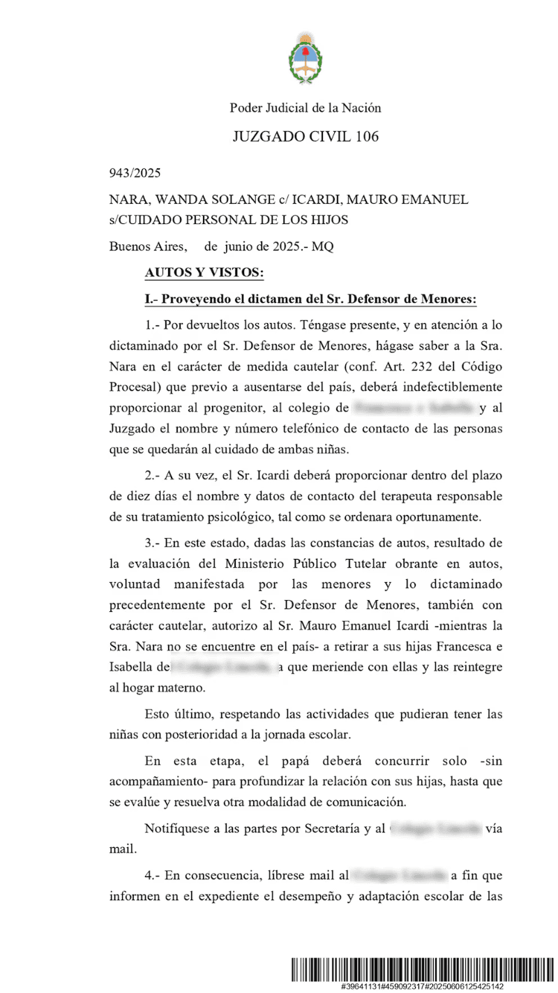 "En este estado, resultado de la evaluación del Ministerio Público Tutelar, con voluntad manifestada por las menores y lo dictaminado precedentemente, también de carácter cautelar, autorizo al señor Mauro Icardi, mientras la señora Nara no se encuentra en el país, a retirar a sus hijas del colegio, que meriende con ellas y las reintegre al hogar materno", concluye el último escrito.