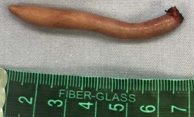 El apéndice, de forma cilíndrica y puntiaguda hacia el final, medía 5,7 centímetros de largo y tenía un diámetro de entre 3 y 5 milímetros en toda su longitud.