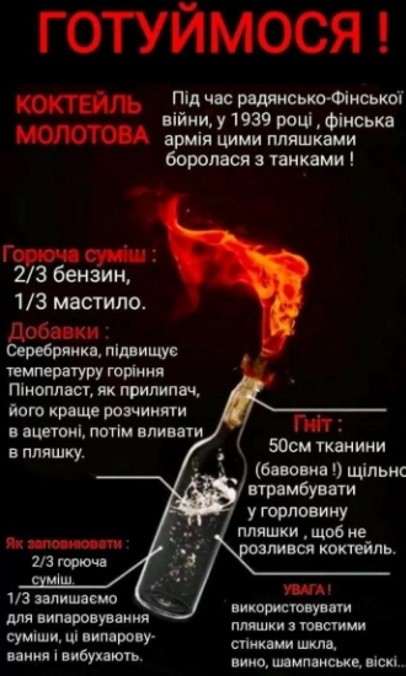 El Ministerio del Interior de Ucrania publicó a través del servicio de prensa y redes sociales el instructivo de cómo preparar una bomba molotov, mientras aguarda por el arribo de las tropas rusas en la capital del país, Kiev.
