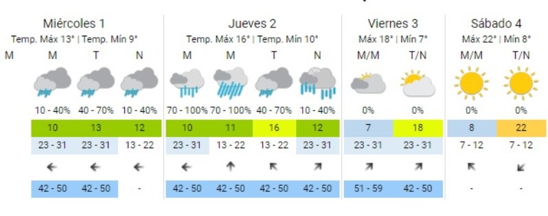 Para el viernes, el SMN anticipa una mejora en las condiciones, ya sin lluvias, con cielo parcialmente nublado, con temperaturas entre los 7 y 18 grados.