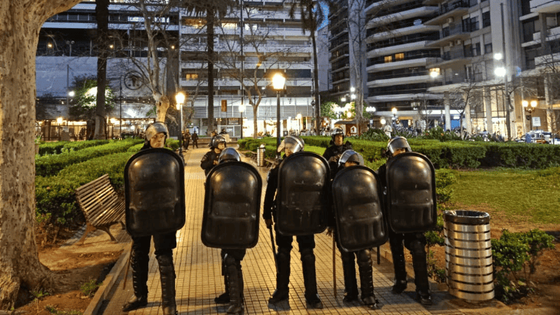La marcha también se abre paso por el centro y se concentra frente a la Bolsa, por la plaza Pringles. A las siete en punto, justo cuando empieza el himno, adentro en el acto, explotan varias bombas de estruendo lanzadas con mortero. La vibración se siente en el hall que da a la calle. Un grupo de gendarmes sale corriendo para reforzar el vallado.