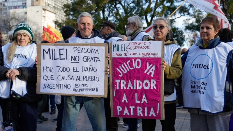 El Frente de Jubilados en Lucha (Frejel) protagoniza un déjà vu en la plaza. Al igual que hace un año, para el aniversario anterior de la Bolsa, el 140, marcharon para reclamar un aumento en sus haberes. En agosto de 2024, fue contra el veto presidencial a la suba. Ahora, porque el Congreso no revirtió esa decisión el miércoles pasado y la anulación de Milei quedó firme.
