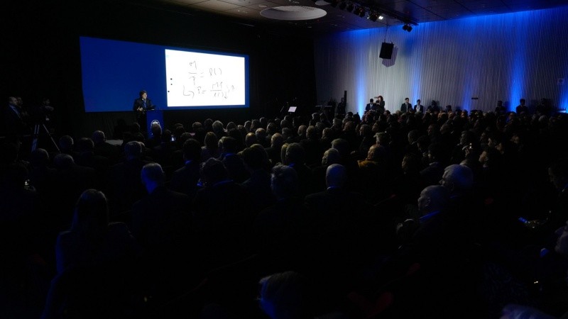 A las 20.13, llega el cierre de Milei con un despliegue de sus capacidades de conferencista. Habla con los lentes en su mano derecha y gesticula con la izquierda como un director de orquesta. O se pone los lentes, dibuja en su tableta y proyecta fórmulas económicas y gráficos en la pantalla.