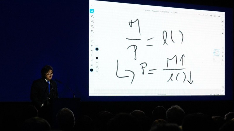 El silencio fue del primer mandatario ante un caso que salpica a la cúpula gobernante y requiere una explicación. Apenas entró a la sala, saludó con su mano derecha y anunció que haría de conferencista. Su objetivo: explicar los motivos de “la volatilidad de la tasa de interés" (que se disparó en los últimos días) de forma "acorde a un auditorio técnico”. Al costado del escenario, en lugar de las imágenes del lugar que se veían en la pantalla, se desplegó una plantilla de dibujo tipo Paint que mostraba lo que dibujaba Milei en vivo. Comenzó así algo que puede definirse como “una clase magistral sobre enfoque del equilibrio general de la economía” o el mayor ejemplo de abstracción de la realidad de un presidente.