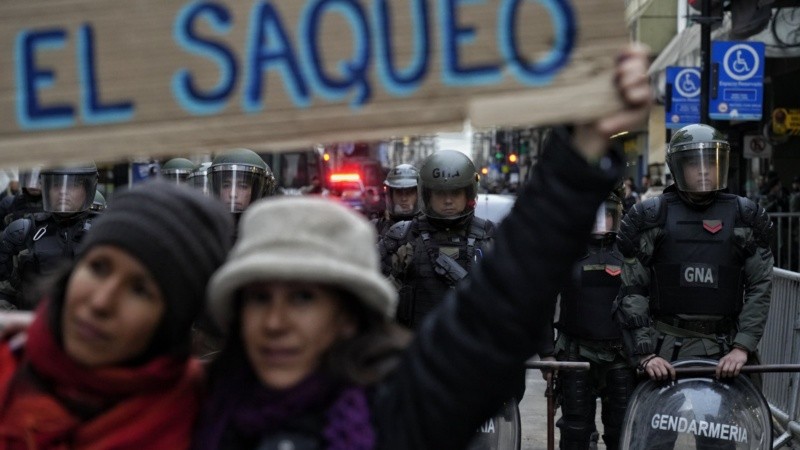 A unos metros, una escena rara. El canal “Chacra TV” hace una entrevista y de fondo una joven abrió un cartel: “Rigi, cheque en blanco para el saqueo”. Tres policías se le acercan. La agarran para sacarla. Un compañero de la manifestante interviene.