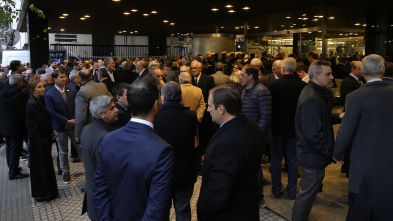 Decenas de hombres de traje y algunas mujeres vestidas para una cena especial esperan para poder volver ingresar al edificio. Acá también la amenaza de bomba fue funcional al operativo. Todos los invitados y empleados fueron desalojados y tuvieron que hacer una larga cola para pasar por un doble control con scanner.
