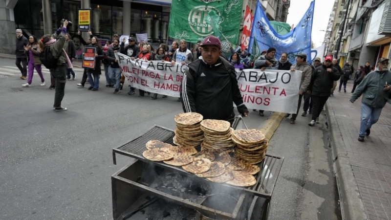 En la plaza Sarmiento, los dirigentes de las organizaciones sociales, políticas y sindicales que convocaron a rechazar, repudiar y declarar la “malvenida” de Milei a Rosario se juntan detrás de una bandera que resume lo que los une: “Pan, abrigo y trabajo”.