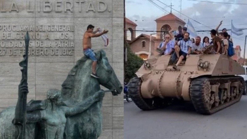 “La pileta en la camioneta” fue otro de los festejos más originales entre los internautas. Y, como no podía ser de otra manera, un hincha rosarino también apareció en el hilo viral de los contenidos más ocurrentes de los fanáticos argentinos. Se trata de un hombre que se subió a una de las esculturas del Monumento Nacional a la Bandera y un gendarme fue a buscarlo con una escalera.