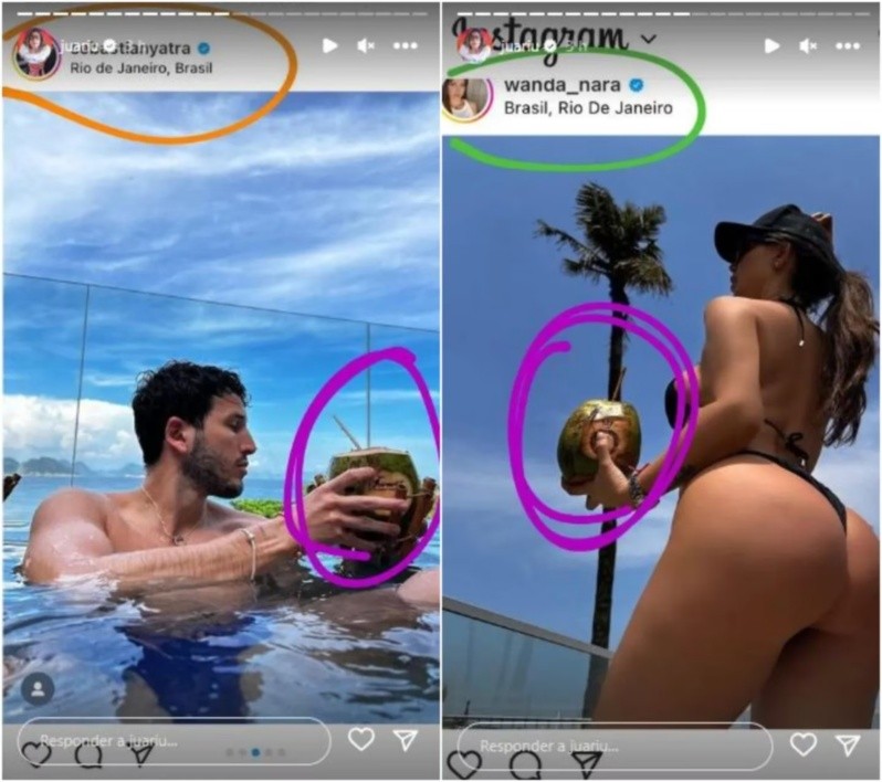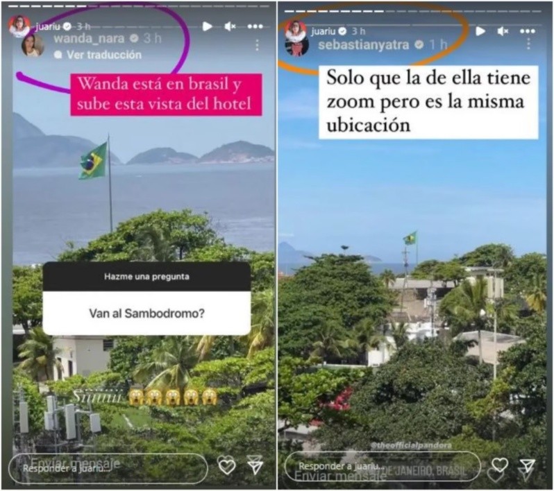 "Les traigo una curiosidad. Una inquietud", empezó. "Wanda está en Brasil y sube esta vista del hotel. La misma que la de Sebastián Yatra, solo que la de ella tiene zoom, pero es la misma ubicación".