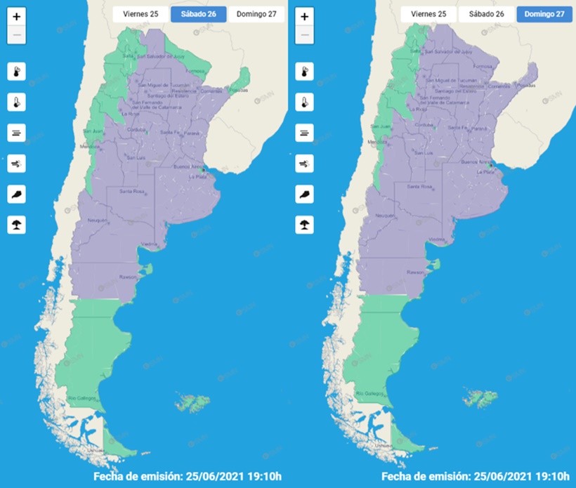 Ya para este sábado se emitió un alerta violeta por temperaturas bajas que incluye el norte de la Patagonia, centro y norte del país.