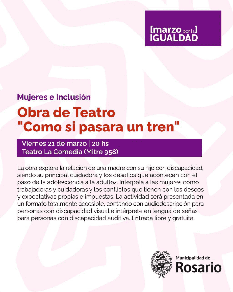 La obra de teatro “Como si pasara un tren” se presentará con entrada libre y gratuita el viernes 21 de marzo a las 20 en el Teatro La Comedia, en un innovador formato totalmente accesible, incluyendo audiodescripción para personas con discapacidad visual e intérpretes en lengua de señas en vivo, para personas sordas, una adaptación doble de la que no se tienen registros en el teatro en Rosario.