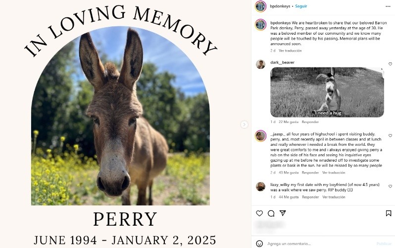 “Estamos desconsolados al compartir que nuestro querido burro de Barron Park, Perry. Era un miembro querido de nuestra comunidad y sabemos que muchas personas se sentirán conmovidas por su fallecimiento”, menciona la publicación donde también compartieron imágenes de Perry.