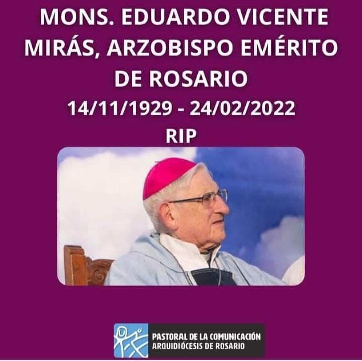Comunicamos el fallecimiento de Mons. Eduardo Mirás, Arzobispo emérito de #Rosario.#Comunicación #CEA pic.twitter.com/yTTHNlILhF
